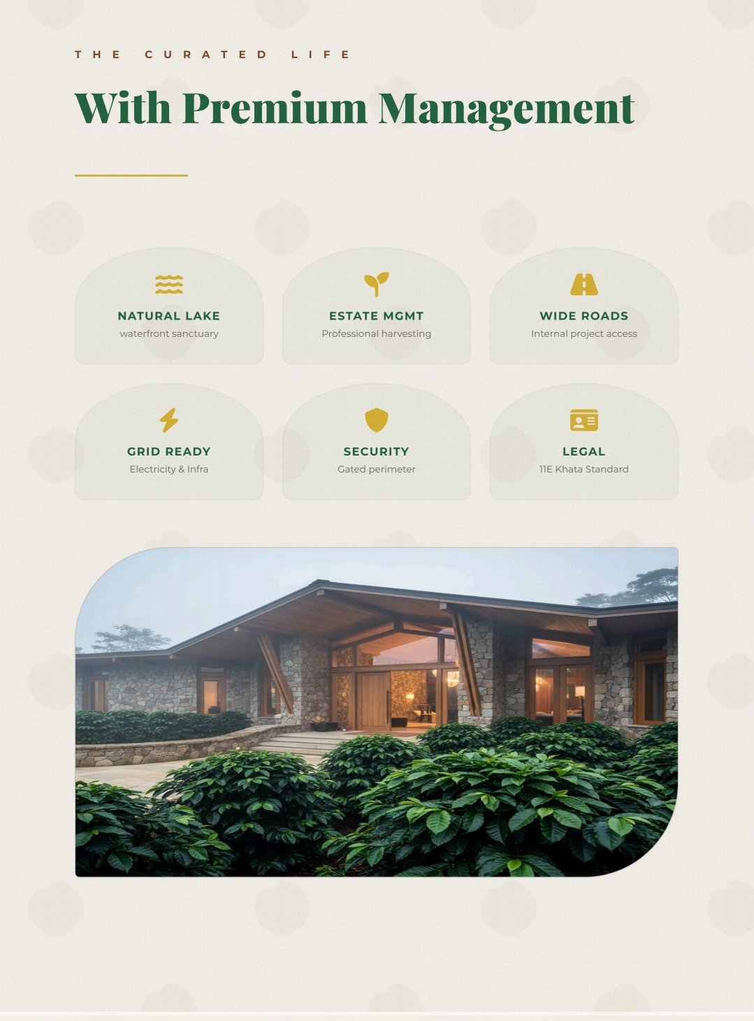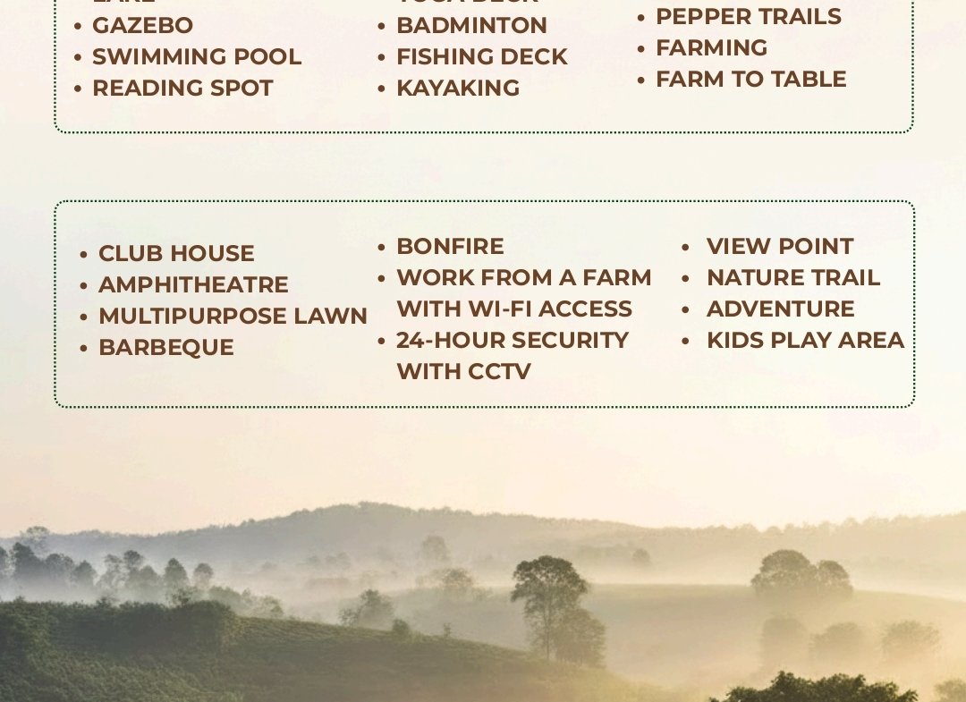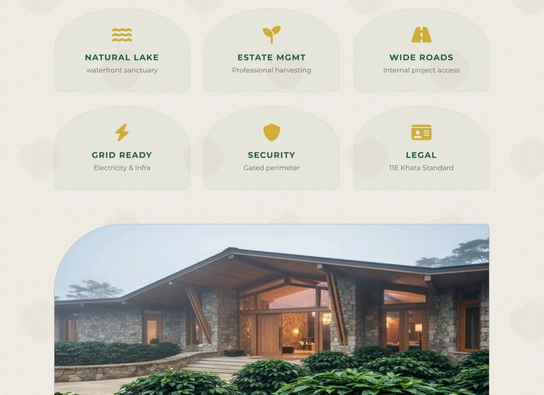 Managed Agroforestry: Your estate is professionally managed by agricultural experts. Plots are typically enriched with high-value crops including Arabica Coffee, Black Pepper, Silver Oak, and exotic fruit trees.