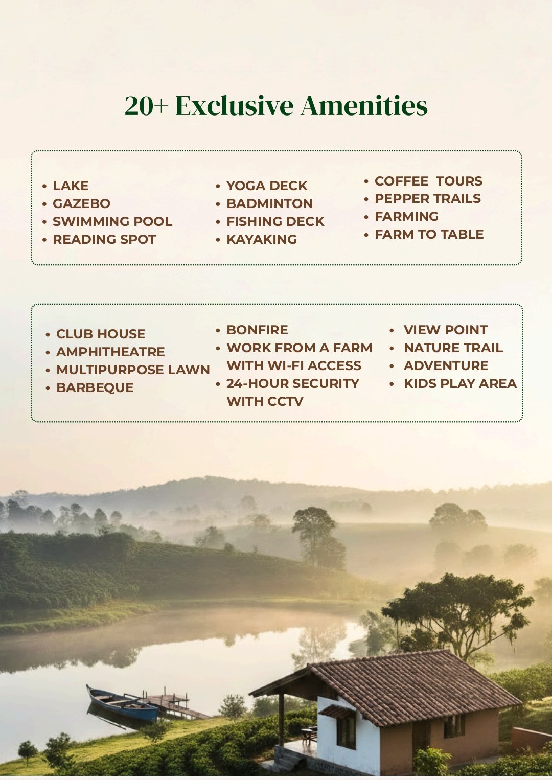 Passive Income: Benefit from seasonal harvests (Coffee & Pepper) and potential rental yields through managed cottage/homestay programs.