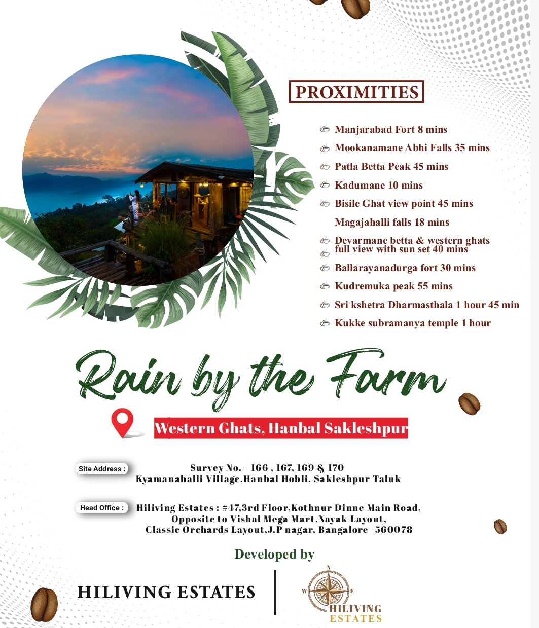 There is a unique symphony that unfolds when the monsoon arrives in Sakleshpur. This isn’t just rain; it’s a transformation. Watch from your veranda as the emerald coffee plantations deepen in hue and the mist rolls gently over the Western Ghats. This property offers more than just acreage—it offers a front-row seat to nature’s most dramatic and soothing season. Own a sanctuary where every rainfall brings a sense of renewal and unparalleled peace.